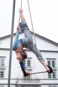 Wie finden wir Leichtigkeit, wenn das Leben uns immer wieder aus der Balance bringt? In „Threading Lightness“ begibt sich Marie auf die Suche nach einem Weg aus dem selbstgeschaffenen Chaos. Ihr einziges Requisit: das Trapez, das mal als Spielpartner am Boden, mal in der Luft zum Sinnbild für Kontrolle und Loslassen wird. In einem ständigen Wechsel zwischen Herausforderung und Entfaltung zeigt das Stück, wie der Versuch, alles zu kontrollieren, oft das Gegenteil bewirkt – und wieviel Kraft in der Fähigkeit liegt, innezuhalten. Schritt für Schritt entdeckt sie die Leichtigkeit, die sie auch am Trapez immer höher steigen lässt. Ihre Performance verbindet Akrobatik, Tanz und Physical Theater zu einer kraftvollen, bewegenden Erzählung.