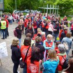 Neheim. Rund 200 Streikende aus dem Sozial- und Erziehungsdienst aus den Städten Arnsberg, Brilon, Marsberg. Lippstadt und Warstein beteiligten sich an einer Demonstration, zu der die Gewerkschaft Verdi aufgerufen hatte und die vom Bexleyplatz in der Neheimer Innenstadt zum Rathaus zog. Dort erneuerte Wolfgang Schlenke, Verdi-Bezirksgeschäftsführer in Meschede, die Forderung nach einer Aufwertung und höherer Eingruppierung dieser Berufe. „Wir erwarten, dass die kommunalen Arbeitgeber ihre Blockadehaltung beenden und uns ein verhandlungsfähiges Angebot vorlegen. Dann könnte auch in kurzer Zeit der Streik ausgesetzt werden“, sagte Schlenke. Zum Abschluss der Kundgebung errichteten die Streikenden auf der Rathaustreppe eine Mauer aus rund 50 beklebten Schuhkartons, die die vielfältigen Tätigkeiten und Qualifikationen der Erzieher symbolisieren sollten. Als die Mauer nach wenigen Minuten von einem Windstoß umgestürzt wurde, sagte ein Streikender schlagfertig. „Das kommt davon, wenn die Aufwertung fehlt!“