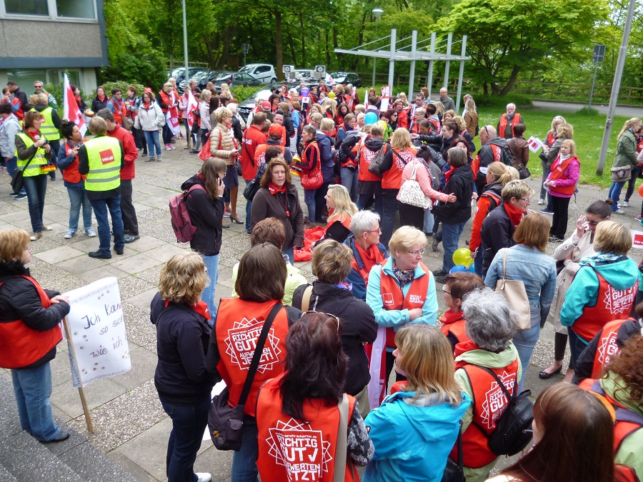 Neheim. Rund 200 Streikende aus dem Sozial- und Erziehungsdienst aus den Städten Arnsberg, Brilon, Marsberg. Lippstadt und Warstein beteiligten sich an einer Demonstration, zu der die Gewerkschaft Verdi aufgerufen hatte und die vom Bexleyplatz in der Neheimer Innenstadt zum Rathaus zog. Dort erneuerte Wolfgang Schlenke, Verdi-Bezirksgeschäftsführer in Meschede, die Forderung nach einer Aufwertung und höherer Eingruppierung dieser Berufe. „Wir erwarten, dass die kommunalen Arbeitgeber ihre Blockadehaltung beenden und uns ein verhandlungsfähiges Angebot vorlegen. Dann könnte auch in kurzer Zeit der Streik ausgesetzt werden“, sagte Schlenke. Zum Abschluss der Kundgebung errichteten die Streikenden auf der Rathaustreppe eine Mauer aus rund 50 beklebten Schuhkartons, die die vielfältigen Tätigkeiten und Qualifikationen der Erzieher symbolisieren sollten. Als die Mauer nach wenigen Minuten von einem Windstoß umgestürzt wurde, sagte ein Streikender schlagfertig. „Das kommt davon, wenn die Aufwertung fehlt!“