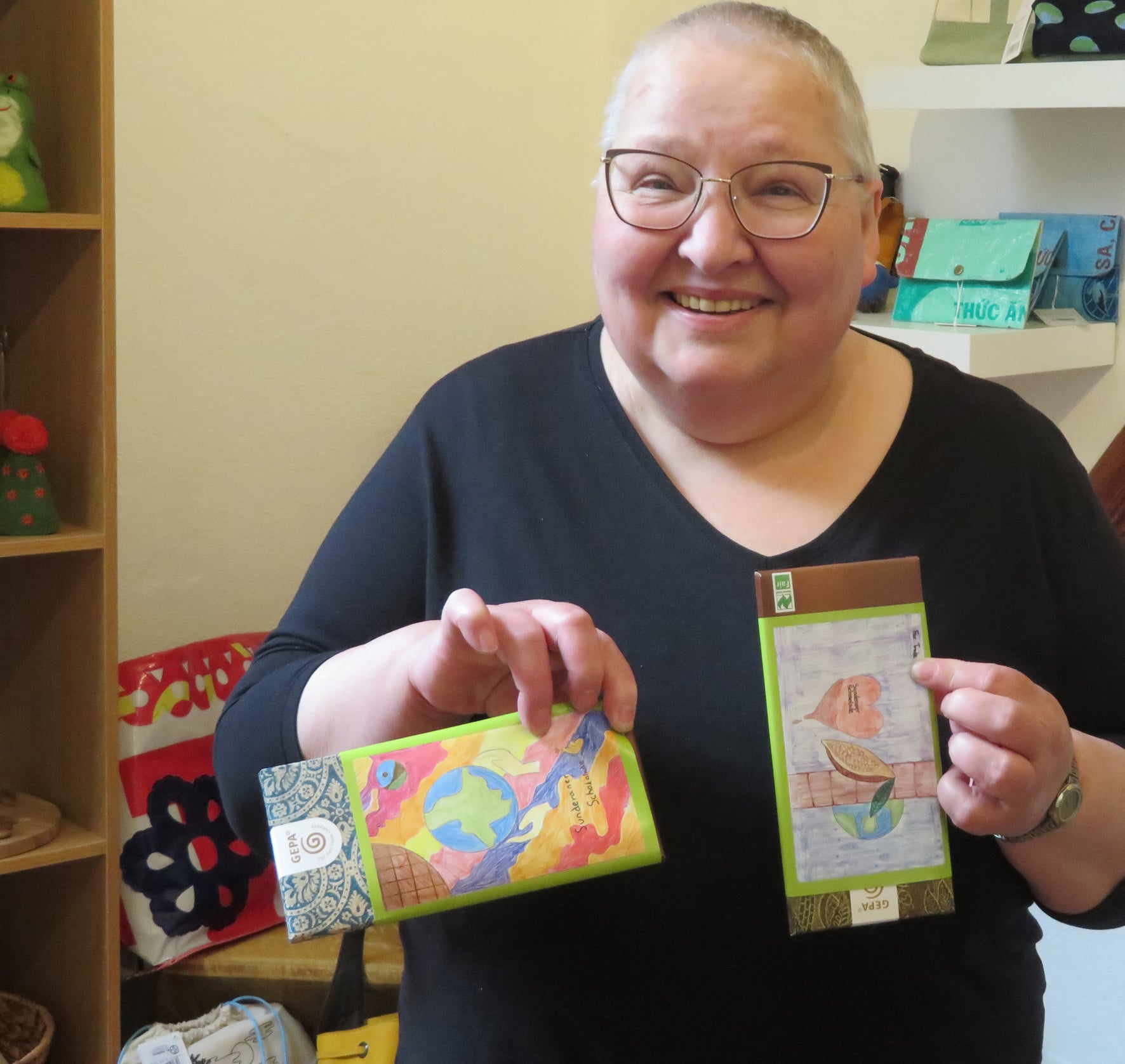Aus der Vielzahl an eingereichten Bildern wurden fünf besonders gelungene ausgewählt und als Banderolen gedruckt. Diese können auf jede Sorte fair gehandelter Schokolade ganz nach Wunsch angebracht werden und sind ein echter Hingucker. Im Weltladen werden die Schokoladen ab sofort – vielleicht als Alternative zu Osterhasen – zum Kauf angeboten.