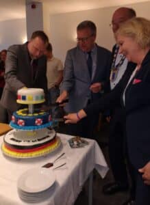 Der feierliche Akt der Veranstaltung endete mit dem gemeinsamen Singen der Nationalhymne. Anschließend wurde die Jubiläumstorte von Würdenträgern aus Kirche und Politik angeschnitten. Auch die dreistöckige Torte spiegelte die Themen des Tages wider. Sie bildete auf der untersten Etage das Thema Grundgesetz und Gründung der Bundesrepublik mit der Farbgebung der Bundesflagge Schwarz-Rot-Gold ab. Die mittlere Etage widmete sich mit blauem Grundton und gelben Sternen dem Europawahl-Thema und die oberste Etage stand für die Kommune Sundern und zeigte die Farben der 16 Ortsteile Sunderns.