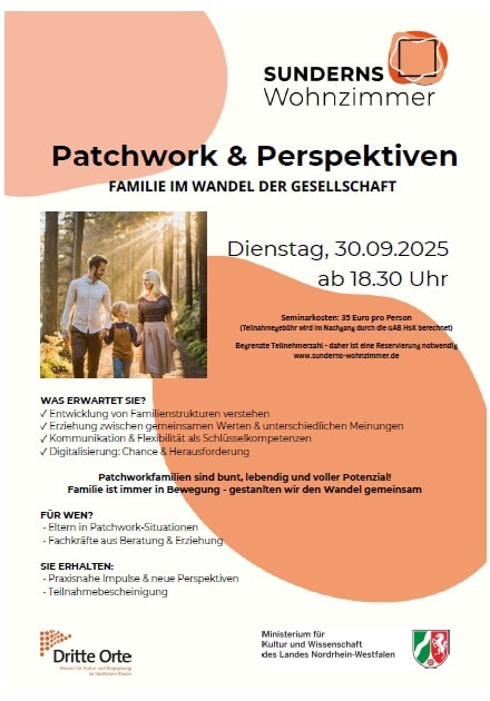 Sundern. Am 30. September 2025 lädt „Sunderns Wohnzimmer“ Interessierte zum Seminar „Patchwork & Perspektiven – Familie im Wandel der Gesellschaft“ ein. Die Veranstaltung richtet sich an Eltern in Patchwork-Situationen sowie an Fachkräfte aus Beratung, Erziehung und Sozialarbeit.Gesellschaftliche Relevanz