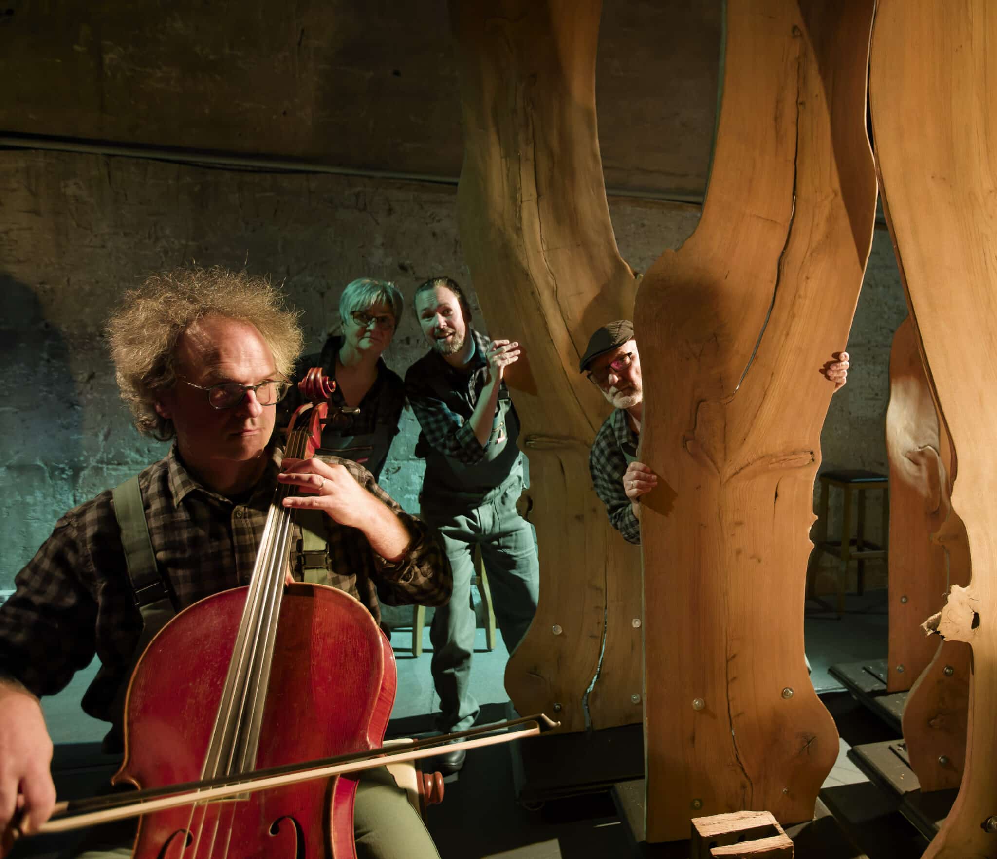 Die Insze­nie­rung „BÄU­ME“ mit Yehu­da Alma­gor, Ursu­la Alma­gor, Ste­fan Wolf und Gun­ther Tie­de­mann (Cel­lo, Musik), ergänzt durch Holz­ob­jek­te von Sebas­ti­an Betz. (Foto: Jür­gen Bechtloff)
