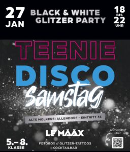 Sundern/Allendorf. Die erste Teenie-Disco in der Alten Molkerei in Allendorf war ein voller Erfolg. 150 Jugendliche besuchten 2023 die Neon Party, sodass feststeht: das muss wiederholt werden! Unter dem Motto „Black & White Glitzer Party“ findet am Samstag, 27. Januar 2024 von 18:00 bis 22:00 Uhr in der Alten Molkerei in Allendorf die nächste Teenie-Disco statt. Schülerinnen und Schüler der Klassen 5 bis 8 sind herzlich eingeladen.