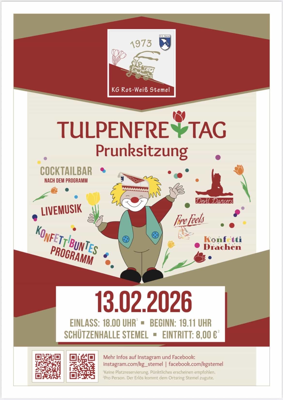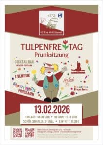 Sundern/Stemel. „Konfetti wirbelt durch das Tal, in Stemel lebt der Karnev(w)al.“ – unter diesem Motto steht die Tulpenfreitag-Prunksitzung der KG Stemel am Freitag, 13. Februar 2026. Durch den Abend führt Präsidentin Aileen Scheffer. Die Veranstaltung findet in der Stemeler Schützenhalle statt.