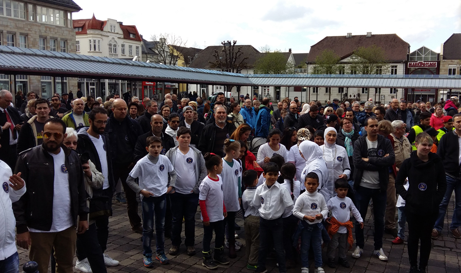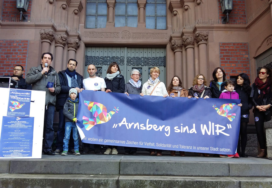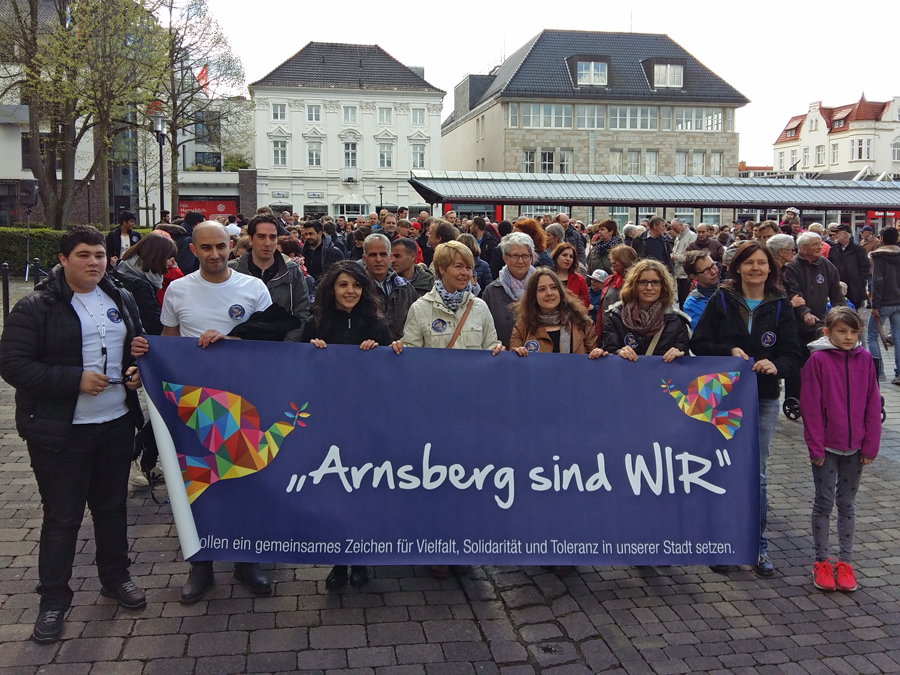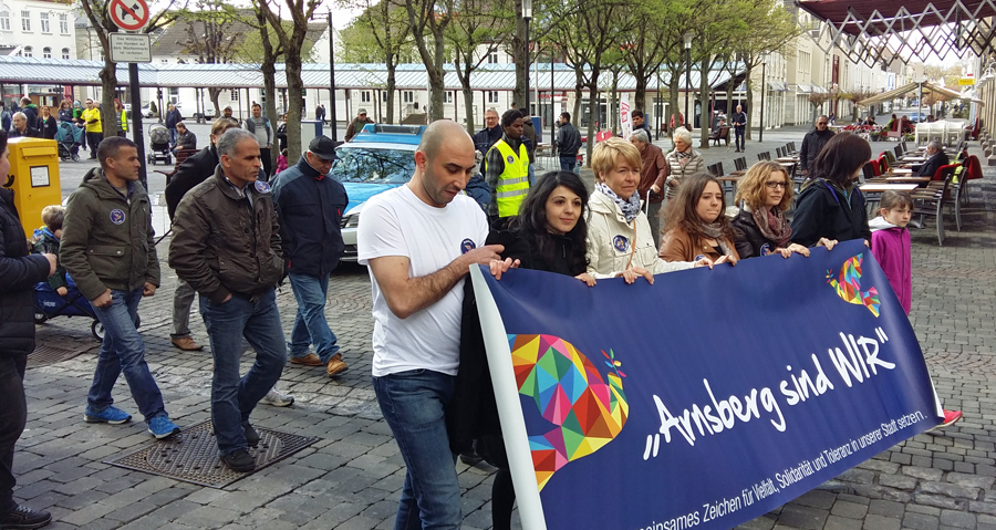 Man habe einen guten Start hingelegt, erinnerte Ersöz an den Schweigemarsch im Januar 2015. Aber seit dem habe sich viel ereignet, nicht nur die Flüchtlingswelle, und viele neue Gesichter seien im Organisationskomitee dazu gekommen. Es freue ihn deshalb besonders, dass auch diesmal so viele Arnsberger gekommen seien, um ein Zeichen zu setzen. Ganz wichtig, so Mitorganisatorin Sina Humpe, sei aber auch, dass alle nach dem Spaziergang noch auf dem Markt verweilen und gemeinsam Zeit miteinander verbringen und sich kennen lernen. Dafür hatten Flüchtlingsfrauen Kekse gebacken und die neuen Nachbarn hatten ein kleines Musikprogramm vorbereitet. Alle Teilnehmer konnten sich über den Sonnenschein freuen und ein Stück des langen Bandes, das die Spaziergänger unterwegs flankiert hatte, anschließend mit nach Hause nehmen.