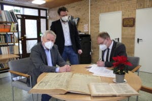 Den Depositalvertrag, in dem festgelegt ist, dass Franz Drees Eigentümer bleibt, die Bände aber im Stadtarchiv lagern und dort genutzt werden dürfen, unterzeichneten Bürgermeister Christoph Weber und Drees in den Räumen des Stadtarchivs in Grevenstein. Stadtarchivar André Algarve freut sich über den Neuzugang, der ein ganzes Regal füllt: „Das ist eine sehr schöne Ergänzung und bietet einen guten Einblick in die Alltagsgeschichte.“