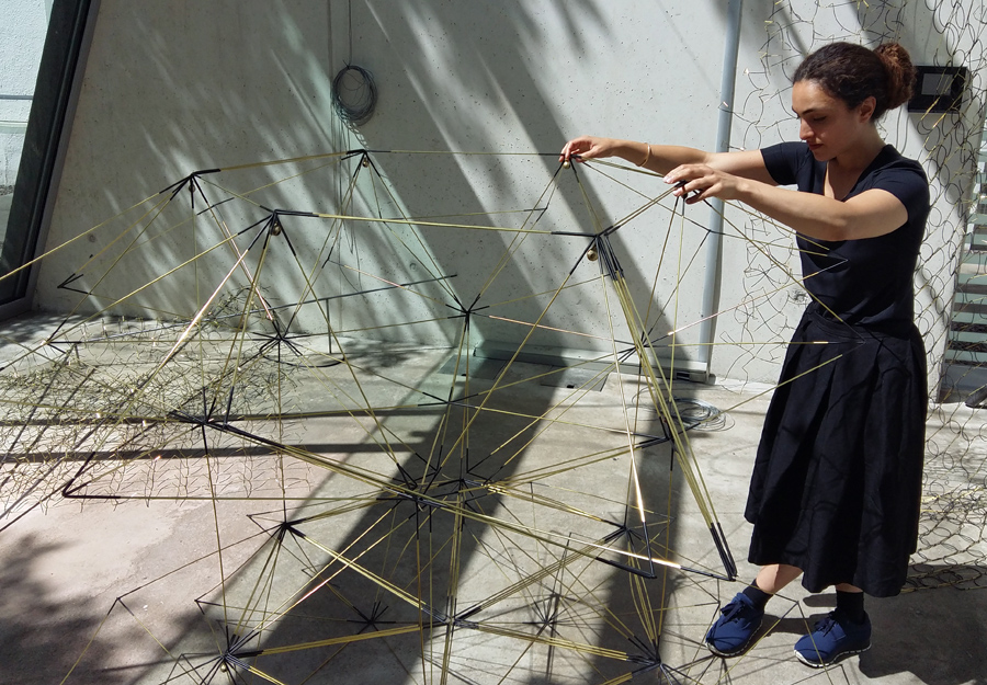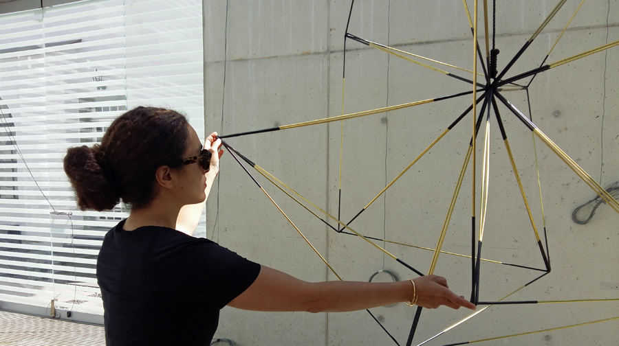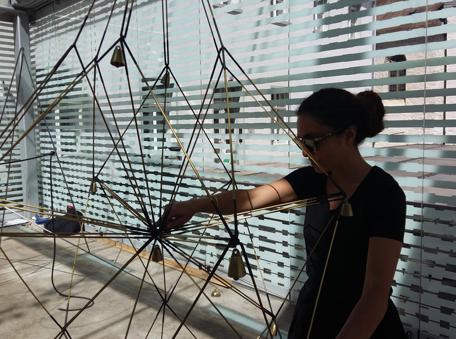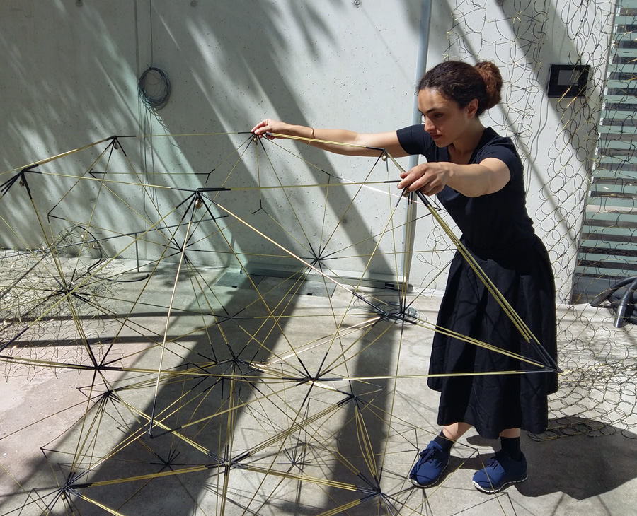 Ganz anders die Ausstellung „Carillon“ im Lichthaus. Die aus unendlich vielen Messingstäben und Gummiverbindungen geschaffenen Skulpturen von Tanaz Modabber erinnern an die uralte Teppichknüpfertradition ihres Geburtslandes Iran, umgesetzt mit ganz neuen Materialien. Die Künstlerin arbeitet an der Schnittstelle von Raum, Kunst und Klang, wobei es ihr gelingt, statischen Strukturen eine formale und akustische Dynamik zu geben. Ein „Carillon“ ist ein großes Glockenspiel, das sich in der Regel in einem Turm befindet. Die Künstlerin bezieht sich mit dem Titel ihres Werks auf die zahlreichen Kirchtürme in Arnsberg. Die Skulpturen, die die ganze Höhe des Lichthauses nutzen, zeichnen Turmsilhouetten nach, verfügen aber auch über eigene Glocken und Glöckchen, die erklingen, wenn der Wind durch das Lichthaus weht oder wenn man die kinetischen Arbeiten auseinander zieht und wieder ineinander fallen lässt.