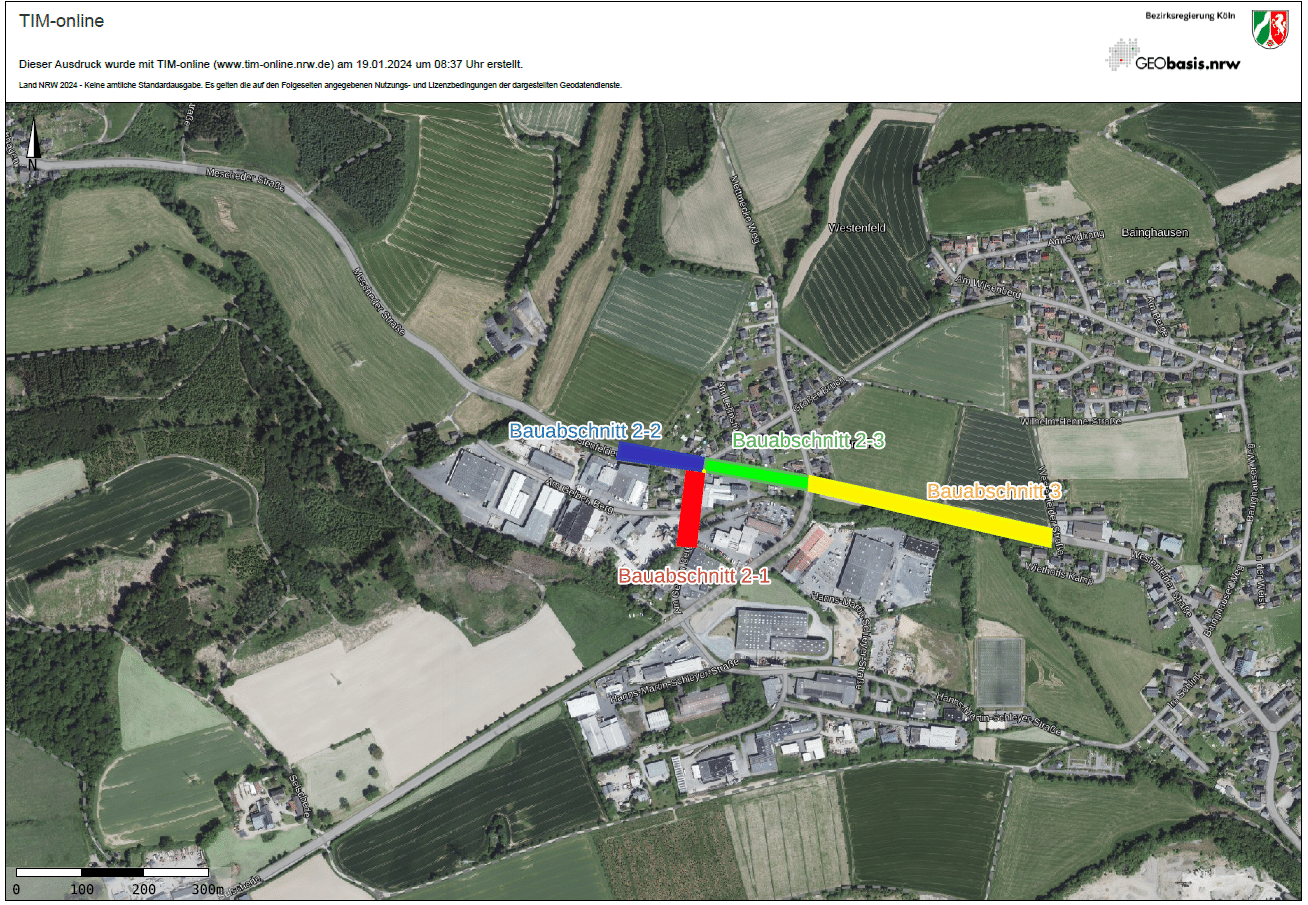 Voll­aus­bau der Orts­durch­fahrt Wes­ten­feld: Über­sicht der Bau­ab­schnit­te. (Foto:  GEObasis.nrw)