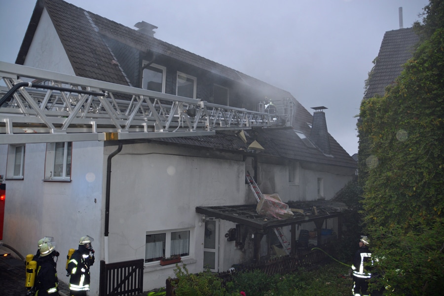 Von außen wurde ebenfalls ein konzentrierter Löschangriff vorgenommen, um den Brand des Vordachs und der umherstehenden Gartenmöbel abzulöschen. Ein Übergreifen der Flammen auf das Nachbargebäude konnte so erfolgreich verhindert werden. Über die Drehleiter wurde ein Teil der Dacheindeckung entfernt, um auch letzte Brand- und Glutnester im Dachstuhl zu erreichen und abzulöschen. Nach rund einer Stunde war der Brand unter Kontrolle. Die Nachlösch- und Aufräumarbeiten dauerten noch bis ca. 8.30 Uhr.