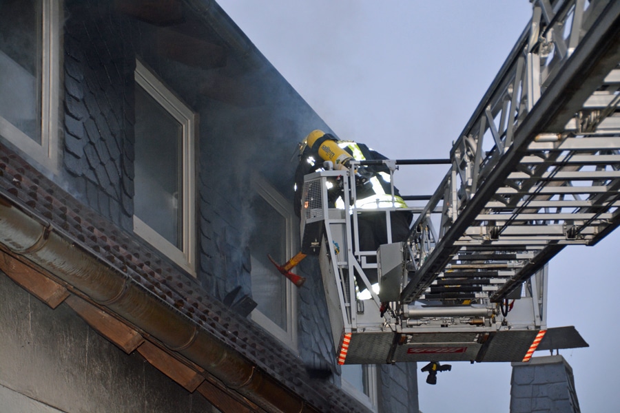 Das Feuer, dass nach ersten Erkenntnissen unter einem Vordach des Wohnhauses ausgebrochen war, hatte sich zu diesem Zeitpunkt bereits bis auf den Dachstuhl des Gebäudes ausgebreitet. Aufgrund der dichten Bebauung in der Altstadt ergab sich eine nicht ganz unkritische Lage für die hier angrenzenden Gebäude älteren Baujahres. Umgehend wurden mehrere Trupps der Feuerwehr mit schwerem Atemschutz ausgerüstet und zur Brandbekämpfung und weiteren Erkundung in das Wohngebäude geschickt. Hierzu wurde auch ein weiterer Zugang zum Gebäude von der Allendorfer Straße genutzt. Im Bereich des Dachgeschosses fanden die Einsatzkräfte einen bereits fortgeschrittenen Brand im Dachstuhl vor. Dieser konnte jedoch ohne nennenswerten Wasserschaden mit einem Hohlstrahlrohr abgelöscht werden.