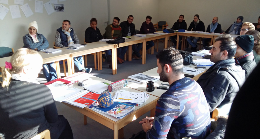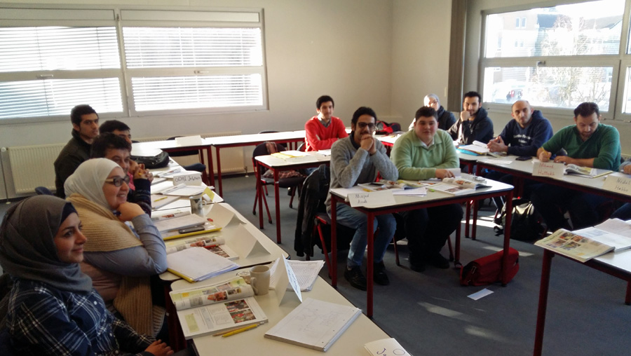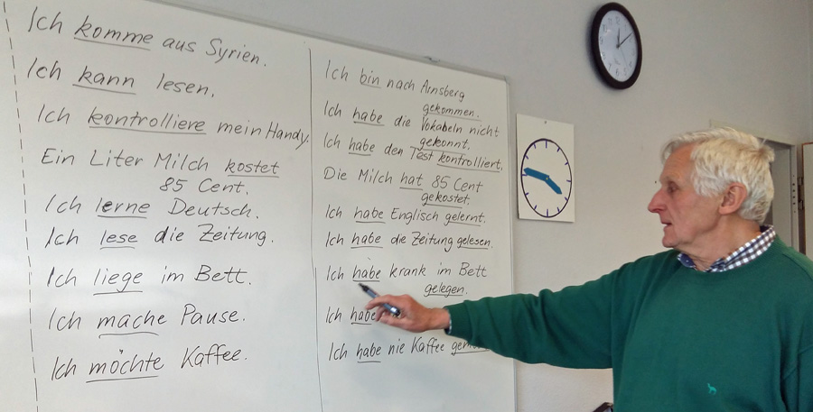 Auch VHS-Besucher, die gerade mal im zweiten Monat Deutsch lernen, konnten ihre Motivation schon recht gut schildern. Eine Mutter von zwei Kindern sagte, sie lerne, weil sie endlich die Fragen ihrer Kinder beantworten können wolle, ein junger Afrikaner sagte, er wolle einen guten Job und dafür brauche er gute Sprachkenntnisse. Auch die Lehrer sind von den neuen Räumlichkeiten angetan. Elisabeth Apke, die drei Tage in der Woche unterrichtet und schon 27 Jahre dabei ist, sagte: „Wunderbar, jetzt haben wir alle mehr Luft.“ Und Kollege Hartmut Zieger, der in Vollzeit unterrichtet, hofft darauf, dass die Kurse jetzt auch nach Lerntempo differenziert werden können. „Es sind Leute dabei, die unglaublich schnell lernen. So was habe ich noch nicht erlebt.“ Von allen Lehrern werde auch bestätigt, dass es noch nie so wenig Disziplinarprobleme gegeben habe, ergänzt Sylvia Müller-Dörfler, die zuversichtlich ist, dass es künftig zumindest wegen der Raumfrage keine Verzögerungen für die Lernwilligen mehr geben werde. Nach wie vor eng ist es allerdings bei qualifizierten Lehrkräften. Hier appelliert die VHS-Leitung an alle, die die nötige Qualifikation haben, sich zur Verfügung zu stellen. So wie Otto Voss. Der bereits seit 13 Jahren pensionierte Schulleiter steht inzwischen wieder vier Tage die Woche vor seinen Schülerinnen und Schülern. „Ich komme aus Syrien. Ich bin nach Arnsberg gekommen. Ich lerne Deutsch“, lesen alle von der Tafel.