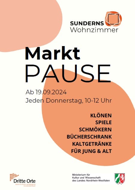 Wei­ter geht es nun vor­erst mit regel­mä­ßi­gen Öff­nungs­zei­ten wäh­rend dem Sun­derner Wochen­markt: ab dem 19.09. ist Sun­derns Wohn­zim­mer jeden Don­ners­tag von 10 bis 12 Uhr unter dem Mot­to „Markt­pau­se“ für Jung und Alt geöff­net. Tages­zei­tun­gen und Zeit­schrif­ten zum Schmö­kern, der Bücher­tausch-Schrank „Hin & Weg“, Kar­ten­spie­le, Spiel­ge­rä­te für Kin­der und kal­te Durst­lö­scher laden zu einer klei­nen Pau­se vom All­tag wäh­rend dem wöchent­li­chen Markt­be­such ein. „Ein­fach vor­bei­kom­men, Leu­te tref­fen, etwas klö­nen und eine gute Zeit haben“ beschreibt Uta Koch das neue Angebot.