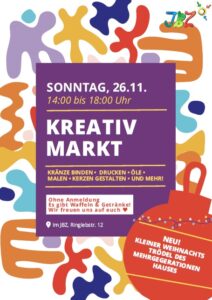 Arnsberg. Am 26.11.2023 ist es wieder soweit: von 14 bis 18 Uhr kann im Jugendbegegnungszentrum Liebfrauen Arnsberg (Adresse: Ringlebstr. 12, 59821 Arnsberg) wieder nach Herzenslust gebastelt und gewerkelt werden. Groß und Klein können sich in verschiedenen Angeboten kreativ austoben. Auch der „Welt Laden“ des JBZ wird geöffnet sein. Zum ersten Mal wird es dieses Jahr außerdem einen kleinen Weihnachtströdel geben, den das Mehrgenerationenhaus „Mittendrin“ organisiert.