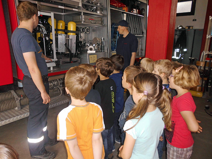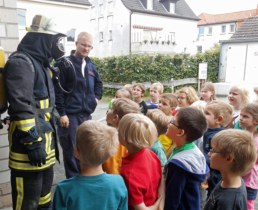 Bei dem nun anstehenden Gegenbesuch wurde das richtige Handeln bei Bränden eingeübt, insbesondere das Herbeiholen von Hilfe durch das Wählen des Notrufs „112“ und durch die Weitergabe aller wichtigen Informationen an die Feuerwehrleitstelle, die für die zielgerichtete Alarmierung der Brandschützer vor Ort zuständig ist. Besonders interessant fanden die Kids natürlich die Löschfahrzeuge und die verschiedenen Ausrüstungsgegenstände. Dass die Helfer im Einsatz unter Schutzkleidung mit Atemschutzgerät etwas befremdlich aussehen, wissen die Kinder nun ebenfalls.