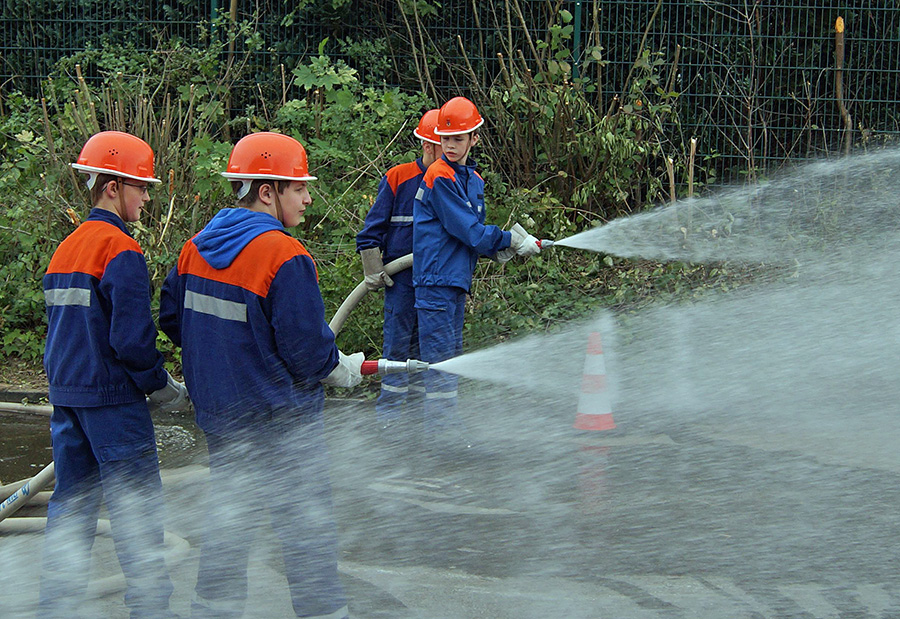 Die in den letzten Monaten weiter angewachsene Jugendfeuerwehr-Gruppe nahm die Gelegenheit war, um vor Publikum einen Löschangriff zu demonstrieren. Die Vorbereitungsübungen hatten sich gelohnt, denn ruck zuck waren die Nachwuchskräfte mit Wasser am Rohr versorgt und konnten den simulierten Brand bekämpfen. Etwas kniffliger war die Aufgabe für die Kameraden aus der aktiven Wehr. Das angenommene Szenario war ein Wohnungsbrand, bei dem viel giftiger Rauch entsteht. Deshalb war die Brandbekämpfung nur mit Atemschutzgeräten möglich, was schließlich auch gelang. Unterstützt wurden sie dabei von Gästen, die, mit Einsatzkleidung ausgestattet, außerhalb des Gefahrenbereichs live am Einsatzgeschehen teilnehmen konnten.