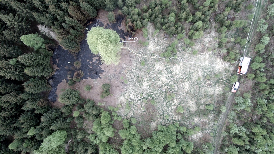 Mit der neuen Feuerwehrdrohne und Kartenmaterial aus dem Einsatzleitwagen wurden die schweren Einsatzfahrzeuge über die Flamke zur Einsatzstelle gelotst. Die letzten 300 Meter mussten dennoch Schlauchleitungen verlegt werden, da die Einsatzstelle mitten im Wald lag. Mit sämtlichen wasserführenden Fahrzeugen des Löschzuges und rund 15.000 Liter Wasser konnte der Brand schnell gelöscht werden. Abschließend wurde die Einsatzstelle noch mit der Wärmebildkamera kontrolliert.
