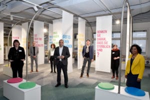 Die Ausstellung bietet Raum für Gespräche und gleichzeitig laden freiwillig engagierte Vermittler*innen ein, den Dialog interaktiv mitzubestimmen, indem die Fragen der Ausstellung an einer Pinnwand beantwortet werden können.