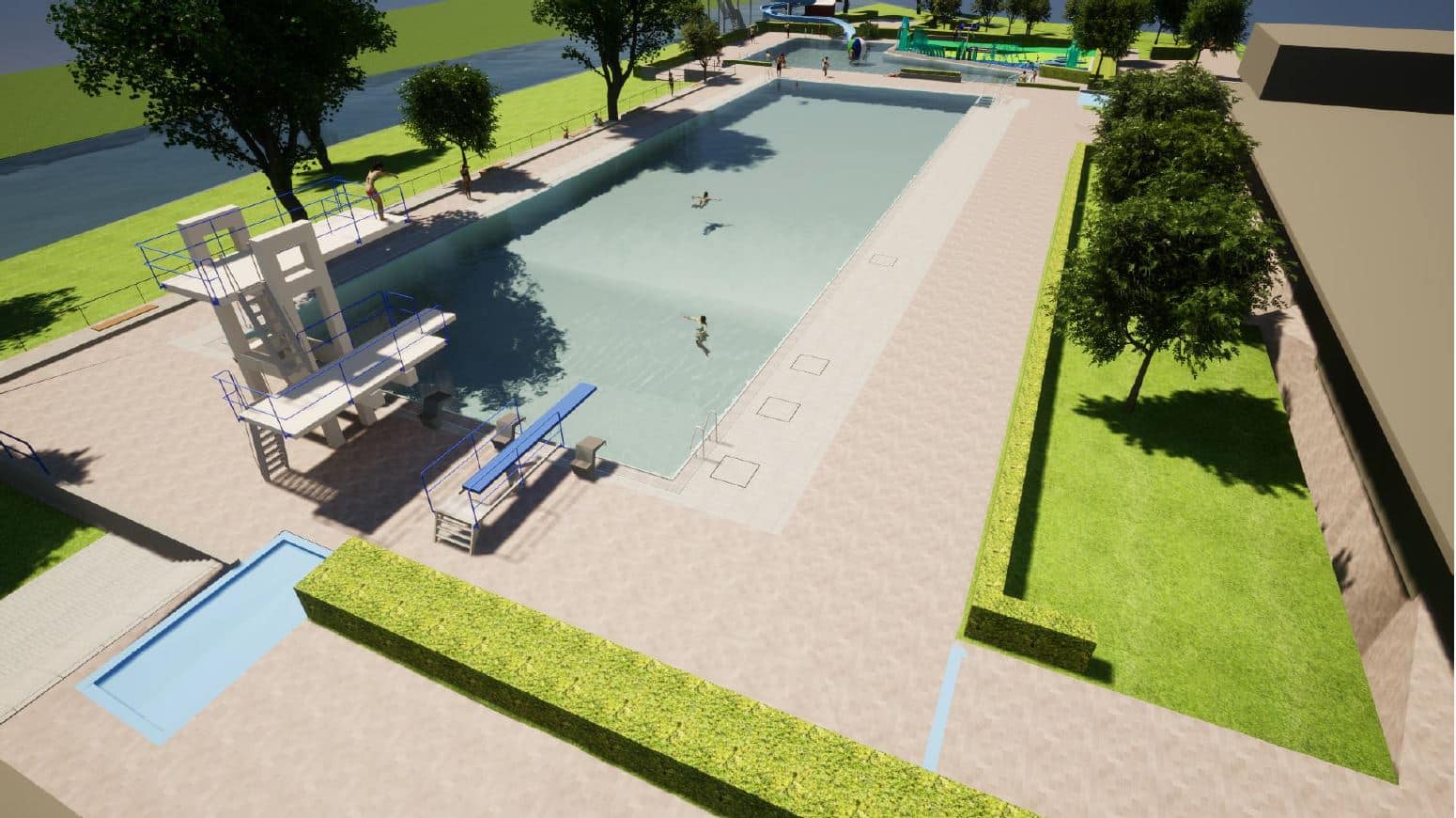 „Das Freibad wird etwas anders aussehen“, kündigte Architekt Stefan Waerder vom Planungsbüro POS4 aus Düsseldorf an. Das lassen auch die ersten Entwürfe erwarten: Ein Bereich des jetzigen Lehrschwimmbeckens soll zu einem so genannten Spraypark umgewandelt werden: Hier könnten Kinder ab einem Alter von drei bis hin zu zehn Jahren erste Wasser-Erfahrungen machen – mit verschiedensten Spielgeräten und Aufenthaltsbereichen. Auch die derzeit stillgelegte Rutsche soll durch eine Erneuerung der Schalung saniert und damit wieder nutzbar werden. Der Übergang zwischen Lehrschwimmbecken zur Schwimmerbecken soll durch eine Sitzstufenanlage attraktiver gestaltet werden.