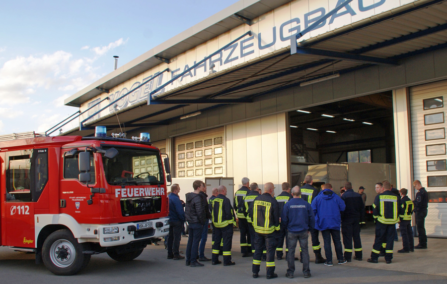 Der Leiter des Löschzugs Neheim, Tobias Jakob, dankte anschließend Florian Hauswirth und dem Geschäftsführer der Firma Vogel Fahrzeugbau, Christian Vogel, für die Einladung und diese seltene und wertvolle Ausbildungsmöglichkeit. Löschzugführer Jakob betonte, dass dies nicht selbstverständlich sei. Die Zusammenarbeit mit den Unternehmen im Stadtgebiet stelle ein wichtiges Element der Arbeit der Feuerwehr dar. Geschäftsführer Vogel war seinerseits beeindruckt von der hohen Anzahl der an der Übung teilnehmenden Einsatzkräfte und betonte, dass er ein solches ehrenamtliches Engagement sehr gern und aus voller Überzeugung unterstütze.
