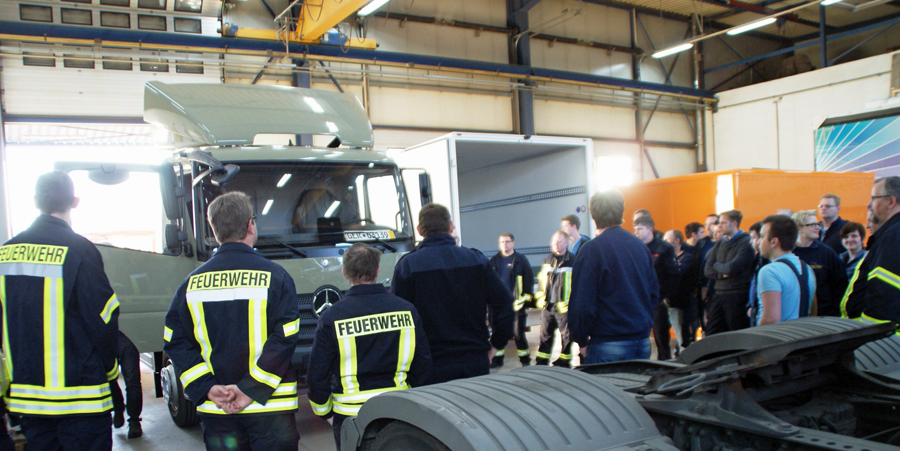 Jetzt gab die Firma Vogel Fahrzeugbau in Neheim den Einsatzkräften jedoch die seltene Möglichkeit, sich anhand verschiedener Fahrzeugtypen über deren komplexe Technik zu informieren. Florian Hauswirth, ein ehrenamtlicher Angehöriger des Löschzugs und beruflich bei der Firma Vogel als Fahrzeugbaumechaniker beschäftigt, hatte den Übungsabend vorbereitet. Die Wehrleute besprachen die richtige Vorgehensweise bei einer patientenorientierten Unfallrettung aus einem Lkw. Hierfür standen unterschiedliche Lkw-Aufbauten von verschiedenen Herstellern zur Verfügung. Ein Sattelauflieger wurde mittels einer Hebebühne angehoben, um die Technik und die Sicherung eines Sattelaufliegers zu erläutern. Das Ausbildungsziel bestand darin, das effektive und sichere Vorgehen bei der patientenorientierten Rettung an Lkw’s zu vermitteln.