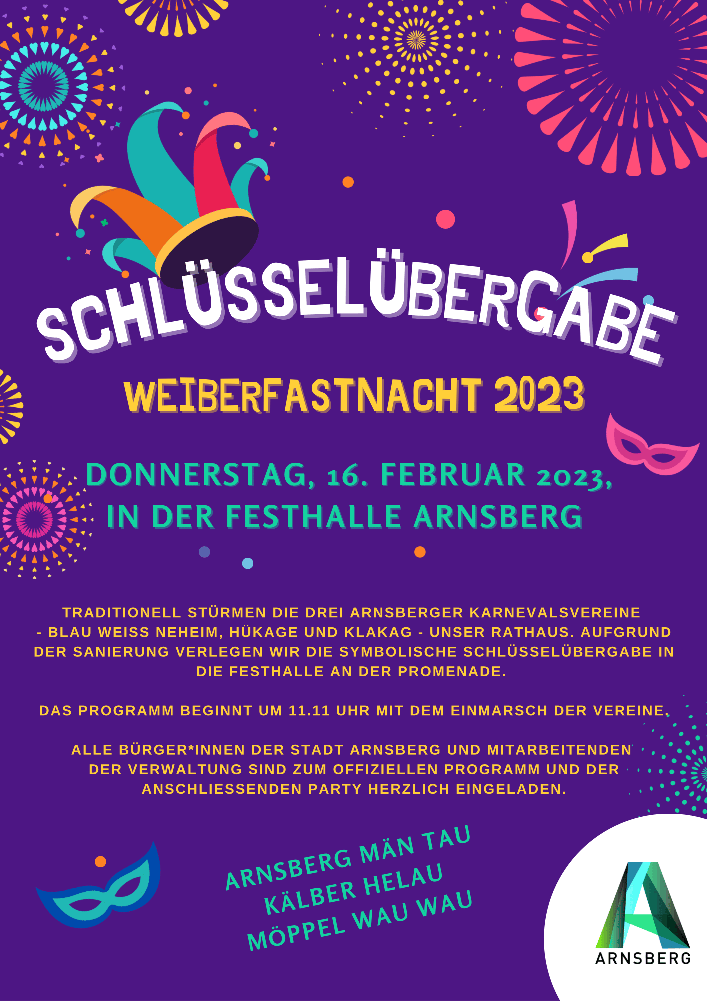 Um 11:11 Uhr stürmen die drei Arnsberger Karnevalsvereine, Karnevalsgesellschaft Blau Weiß Neheim, Hüstener Karnevalsgesellschaft (HüKaGe) und die Kleine Arnsberger Karnevalsgesellschaft (KLAKAG), das Gebäude an der Promenade. Nach dem offiziellen Programm startet dann die große Karnevalsparty, zu der alle Bürgerinnen und Bürger sowie alle Mitarbeiterinnen und Mitarbeiter der Stadt Arnsberg herzlich eingeladen sind.