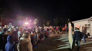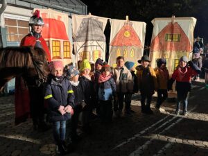 Nach dem Tref­fen um 18:00 Uhr am Kin­der­gar­ten zog eine beein­dru­cken­de Kulis­se von rund 170 Kin­dern, Eltern und Groß­el­tern mit bun­ten Later­nen vor abend­li­cher Kulis­se in Beglei­tung der „Hei­li­gen Mar­ti­na“ (Johan­na Schul­te) auf ihrem Pferd zur Dorf­mit­te. Nach dem gemein­sa­men Sin­gen eines Mar­tins­lie­des vor dem Abmarsch wur­de wäh­rend des Zuges ein wei­te­rer „musi­ka­li­scher Zwi­schen­stopp“ eingelegt.