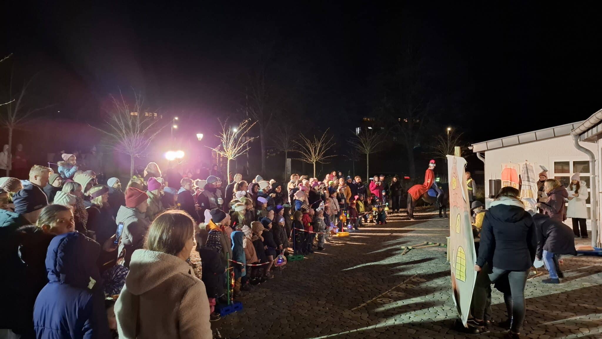 Nach dem Tref­fen um 18:00 Uhr am Kin­der­gar­ten zog eine beein­dru­cken­de Kulis­se von rund 170 Kin­dern, Eltern und Groß­el­tern mit bun­ten Later­nen vor abend­li­cher Kulis­se in Beglei­tung der „Hei­li­gen Mar­ti­na“ (Johan­na Schul­te) auf ihrem Pferd zur Dorf­mit­te. Nach dem gemein­sa­men Sin­gen eines Mar­tins­lie­des vor dem Abmarsch wur­de wäh­rend des Zuges ein wei­te­rer „musi­ka­li­scher Zwi­schen­stopp“ eingelegt.