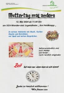 Mütter und alle Familienmitglieder sowie natürlich auch alle anderen Gäste sind in nettem Ambiente mit Musik, Snacks, Getränken zu viel Spaß bei guten Gesprächen eingeladen. Getreu dem Motto: Zeit hat man nur, wenn man sie sich nimmt. Der Eintritt ist frei. Getränke und Snacks werden wie stets zu familienfreundlichen Preisen angeboten. Anmeldungen sind nicht erforderlich.