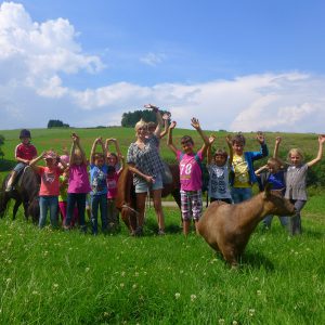 Mit dem Motto „Ronja Räubertochter“ wurde der Tiggeshof kurzerhand zur Burg umfunktioniert und die Spielscheune zur echten Räuberfeste. Die Kinder bastelten Kostüme und Schwerter und lernten den Räubertanz. Nebenbei griffen sie dem Bauern tüchtig unter die Arme und fütterten und versorgten alle Tiere. Das neugeborene Kälbchen „Lora“ wurde besonders liebevoll umsorgt und durfte sogar in die Räuberfeste einziehen.