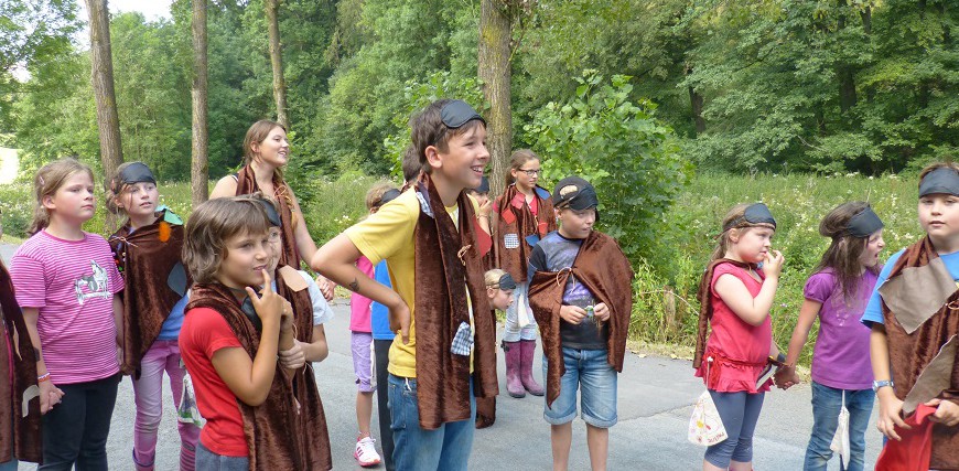 Den Höhepunkt der Woche stellte die Übernachtung im Stroh dar. Jedes Kind errichtete seine eigene Höhle in welcher es nach einer Nachtwanderung im dunklen Wald schlafen durfte. Und der Schlaf war bitter nötig, denn am selben Tag ging es auf die große Schatzsuche. Hier besiegten die tapferen Räuber den Graugnom und den Waldgeist, schlichen durch den Hexenwald und versteckten sich vor den Wilddruiden. Sie bestanden viele knifflige Prüfungen bei denen vor allem Teamarbeit und Wissen rund um die Natur gefragt waren. Als Belohnung hielten sie den Schatz von der legendären Lady Lisa in den Händen, die sie natürlich auch persönlich kennen lernen durften. Besonders stolz sind die Kinder auf ihren selbst gebauten Walderlebnis-Spielplatz. Hier durften die Eltern beim Abschlussfest den Fühlpfad testen, mit einem Baum telefonieren, auf dem Ast-Xylophon klimpern und testen ob sie die Spruchkraft eines Frosches oder eines Eichhörnchens haben..