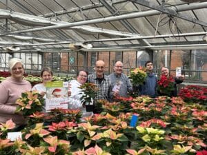 Mena Kal­le (l.) und Kris­ti­na Gerold (r.) dün­gen die Weih­nachts­ster­ne. Die­se müs­sen ein Mal in  der Woche gedüngt wer­den, damit sie gut gedei­hen, erläu­tert Kris­ti­na Gerold. (Foto: Dilek Stadtler)