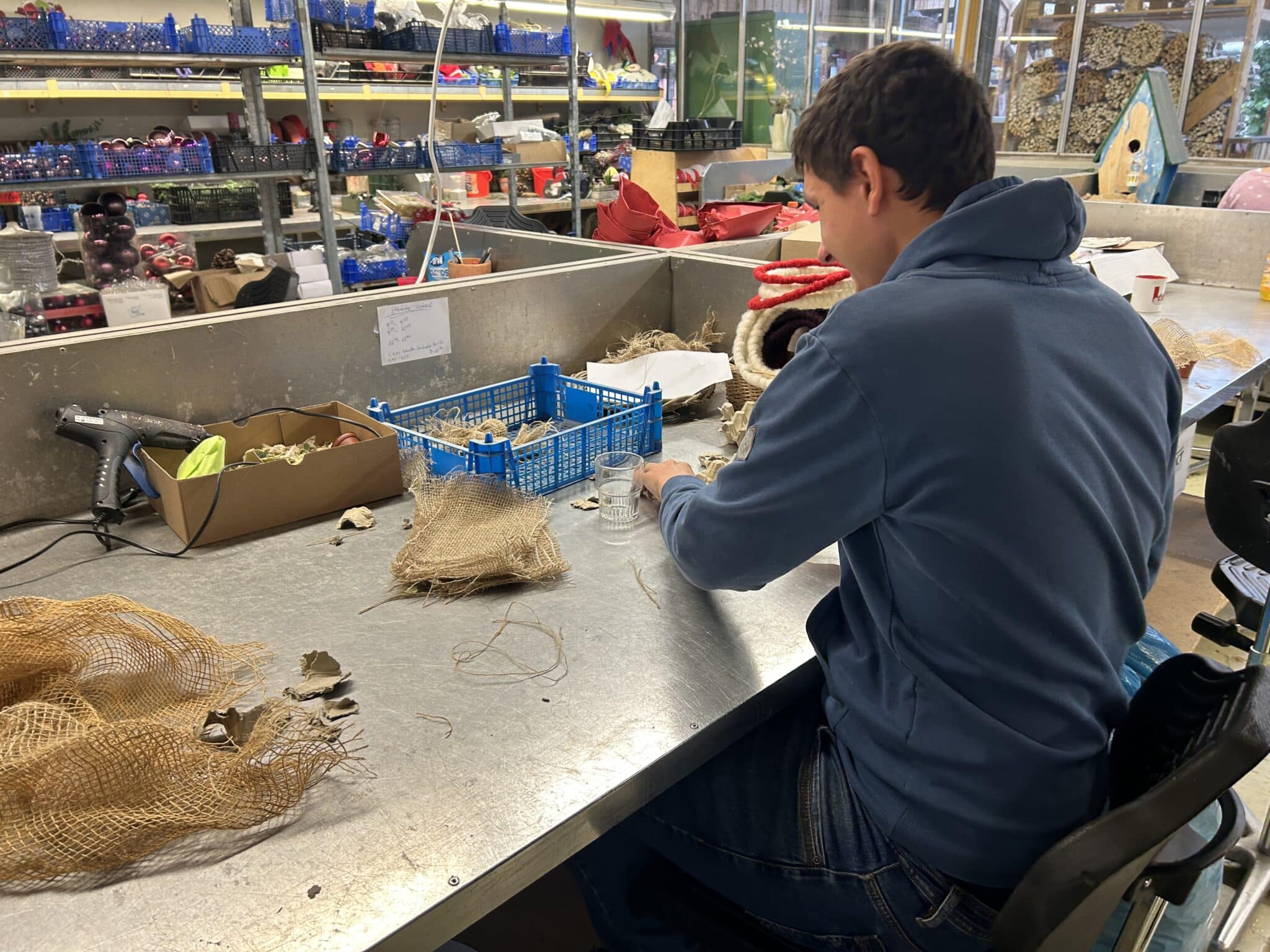 Jus­tin Har­rings wirkt der­zeit u.a. an der Her­stel­lung von Kamin- und Ofen­an­zün­dern mit. Die­se wer­den sowohl im Werk­statt­la­den, als auch auf der Win­ter­welt zum Ver­kauf ange­bo­ten. (Foto: Dilek Stadtler)