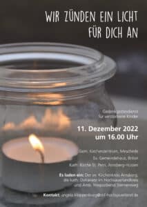 Am weltweiten Gedenktag für verstorbene Kinder, immer am zweiten Sonntag im Dezember, dem „Worldwide Candlelighting“ werden Gottesdienste gefeiert, in denen für jedes Kind eine Kerze angezündet wird. So entsteht weltweit ein Lichterband, das Trost und Hoffnung spenden kann.