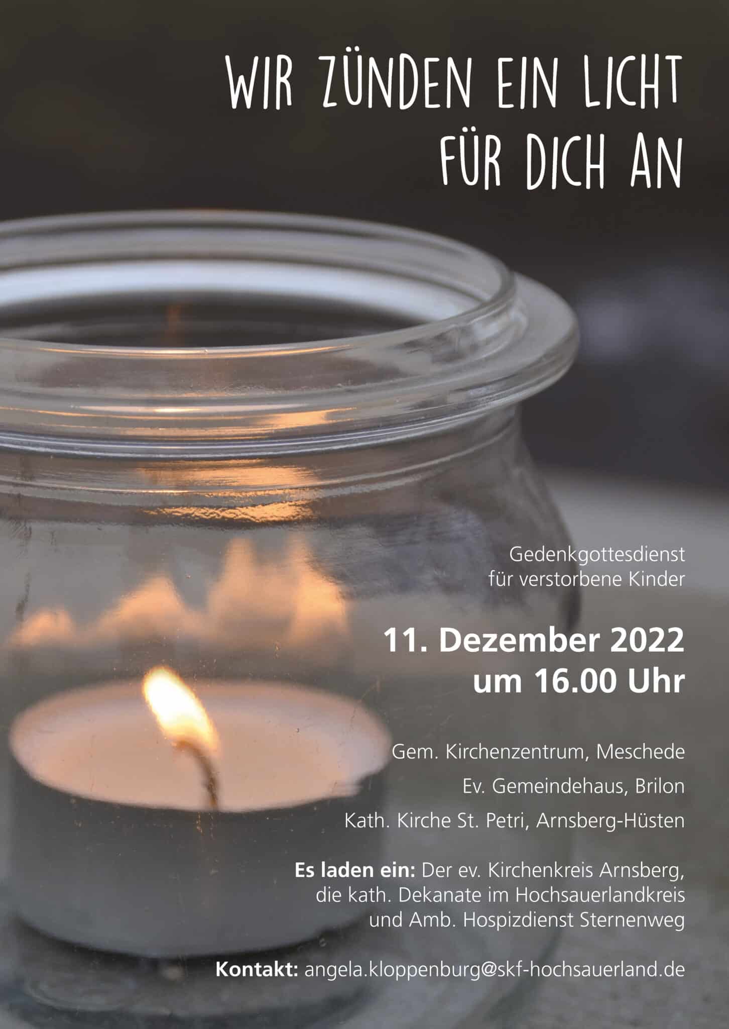 Im Hochsauerland laden die katholischen und evangelischen Kirchen und der Kinderhospizdienst „Sternenweg“ alle verwaisten Eltern, Geschwister, Großeltern und Freunde zu drei Gedenkgottesdiensten am 11. Dezember um 16.00 Uhr ein: