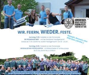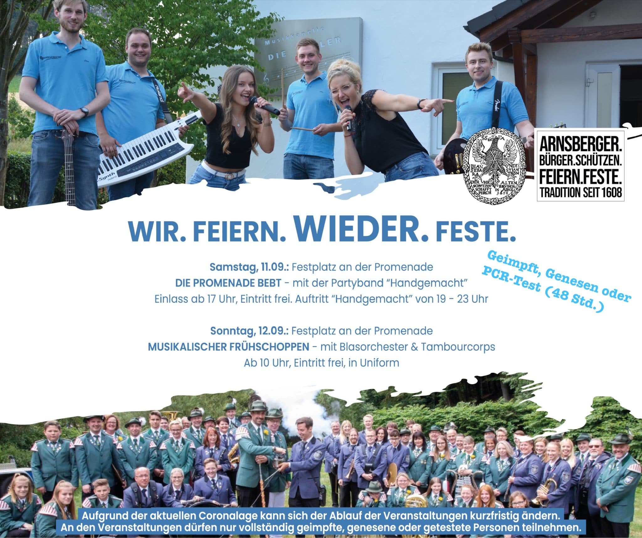 Arnsberg. Lange wurde die aktuelle pandemische Lage beobachtet, jetzt blicken die Arnsberger Bürgerschützen positiv auf das kommende Wochenende: Die Bürgerschützen bringen am zweiten September-Wochenende nach all dem Verzicht etwas Schützenfest-Flair zur Festhalle. Unter dem Motto „Wir.feiern.wieder.Feste“ laden die Schützen zu zwei Veranstaltungen herzlich ein: