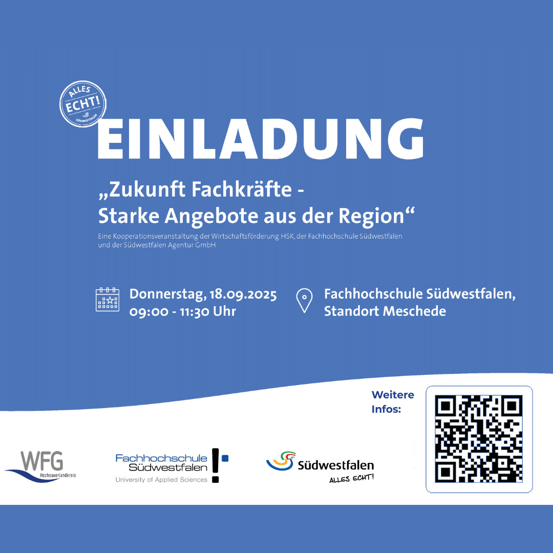 Hochsauerlandkreis. Die Wirtschaftsförderungsgesellschaft Hochsauerlandkreis, die Südwestfalen Agentur und die Fachhochschule Südwestfalen laden am 18. September 2025 von 9:00 bis 11:30 Uhr zur gemeinsamen Veranstaltung „Zukunft Fachkräfte – Starke Angebote aus der Region“ ein. Die kostenfreie Veranstaltung findet an der Fachhochschule Südwestfalen in Meschede statt und richtet sich an Unternehmen sowie interessierte Fachbesucherinnen und -besucher aus dem Hochsauerlandkreis.
