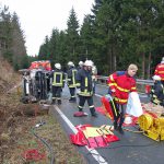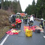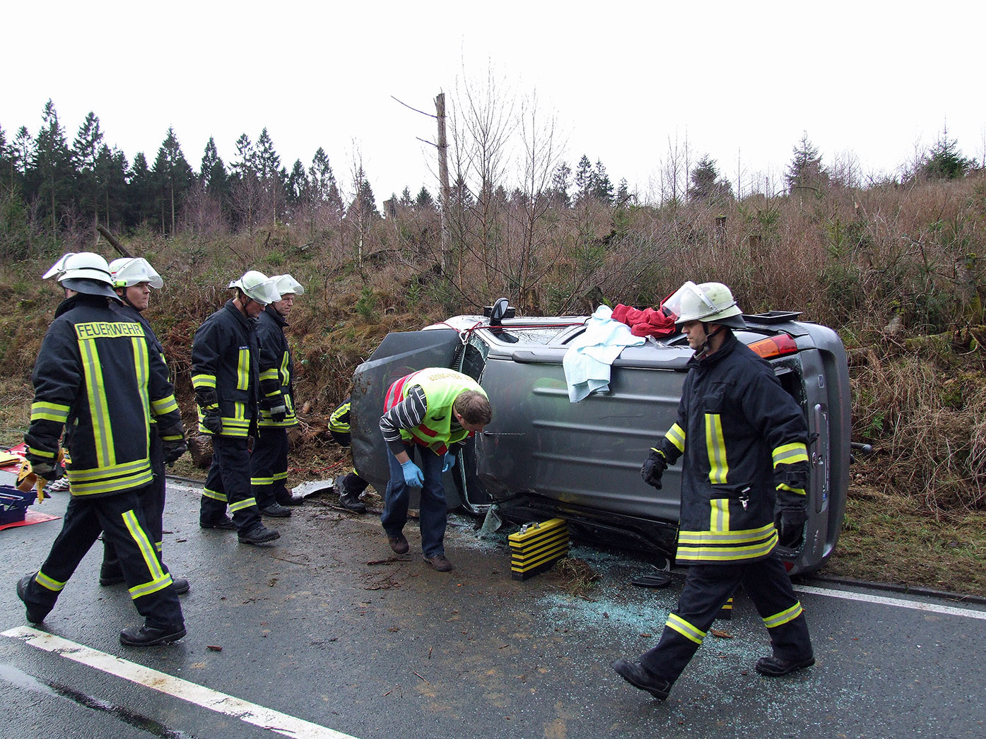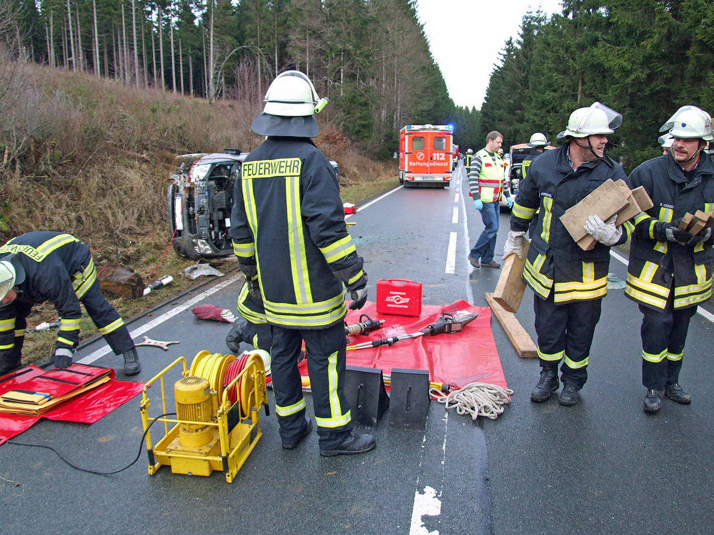 Ein PKW, besetzt mit zwei Personen, war ausgangs einer Kurve von der Fahrbahn abgekommen, in den Graben gerutscht und dort vor einen Baumstumpf geprallt. Durch die Wucht des Aufpralls war das Fahrzeug auf die Seite gekippt. Die Insassen, der 79-jährige fahrer und seine 76-jährige Ehefrau, konnten sich nicht selbst befreien.